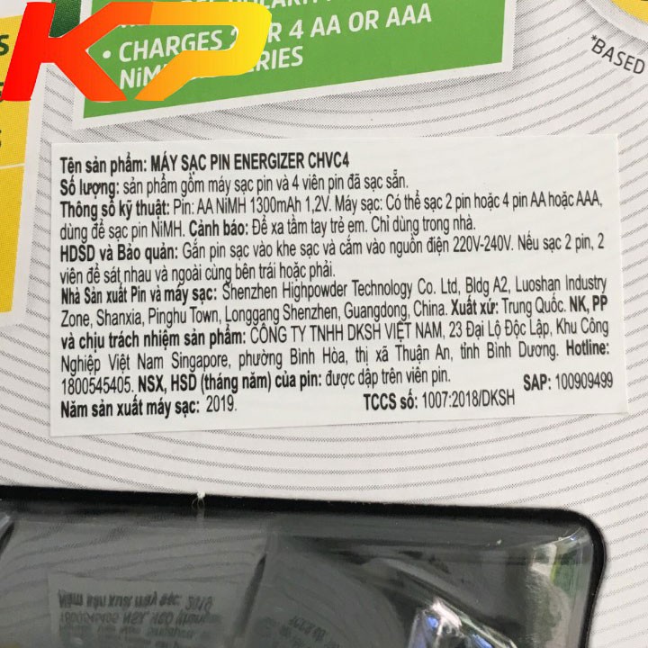 Máy sạc pin CHVC4 Kèm 4 pin AA 1300mahKhi bạn đang sử dụng các loại pin sạc thì ắt hẳn bạn phải sắm cho mình một máy sạc pin để mỗi lần hết pin chúng ta nạp lại năng lượng cho pin để sử dụng cho lần tiếp theo. Tiện lợi và nhanh chóng. Không gây gián đoạn trong quá trình sử dụng các thiết bị điện tử.Máy sạc CHVC4 của hãng Energizer có khả năng sạc được từ 2-4 viên pin AAA hoặc AA cùng lúc, theo tiêu chuẩn chất lượng của hãng dòng điện vào ổn định giúp tăng tuổi thọ của pin.