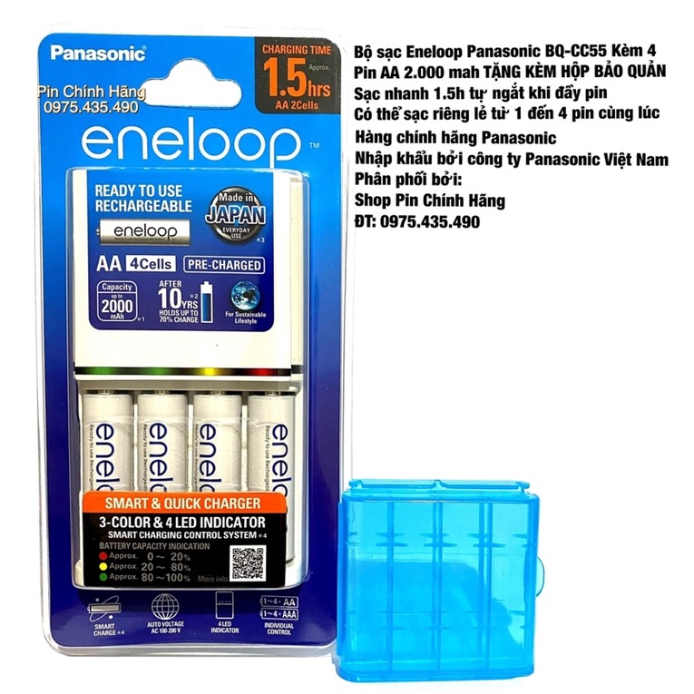 Combo sản phẩm gồm máy sạc cao cấp BQ CC55 , 4 Viên pin ENELOOP 1900 ~ 2000 mAh ngoài ra quý khách còn được TẶNG THÊM HỘP ĐỰNG PIN SẠCMáy sạc thông minh Panasonic Bq cc55 là dòng máy sạc nhanh với tính năng tự ngắt khi pin đầy năng lượng , tăng tuổi thọ pin đồng thời rút ngắn thời gian sạc ( sạc được 1 - 4 viên pin dung lượng 2000mah trong vòng 1,5h)