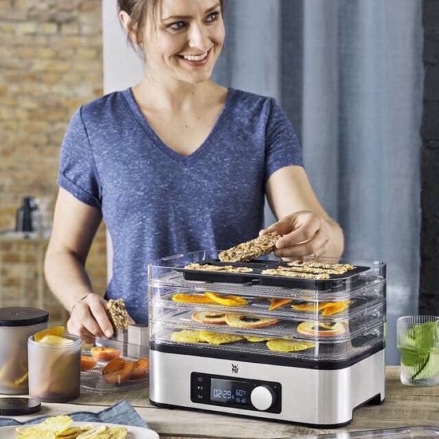 - Màn hình điển tử LCD hiển thị nhiệt độ và thời gian sấy còn lại. Vỏ máy làm bằng chất liệu thép không gỉ cao cấp Cromargan 18/10 độc quyền WMF. Máy có 5 tầng sấy từ chất liệu Tritan, bền đẹp và an toàn cho thực phẩm.