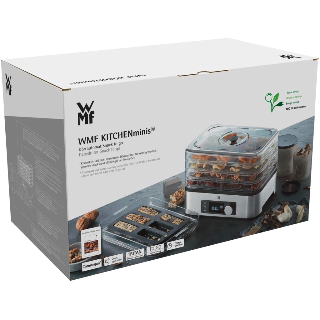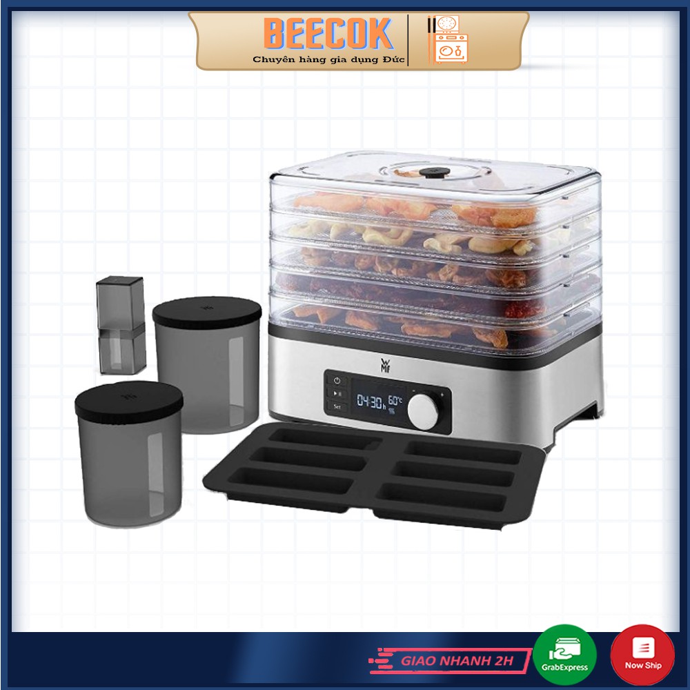 - Màn hình điển tử LCD hiển thị nhiệt độ và thời gian sấy còn lại. Vỏ máy làm bằng chất liệu thép không gỉ cao cấp Cromargan 18/10 độc quyền WMF. Máy có 5 tầng sấy từ chất liệu Tritan, bền đẹp và an toàn cho thực phẩm.