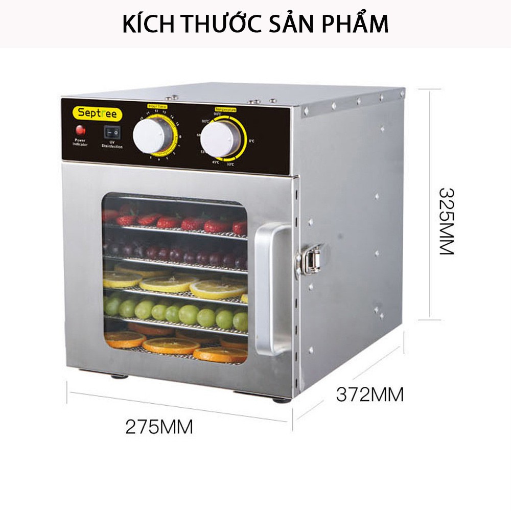 ✅Dung tích lớn gồm 6 khay riêng biệt. Được thiết kế với chất liệu thép không gỉ, hiệu năng suất sắc trong các dòng máy sấy khô hoa quả mini trên thị trường.