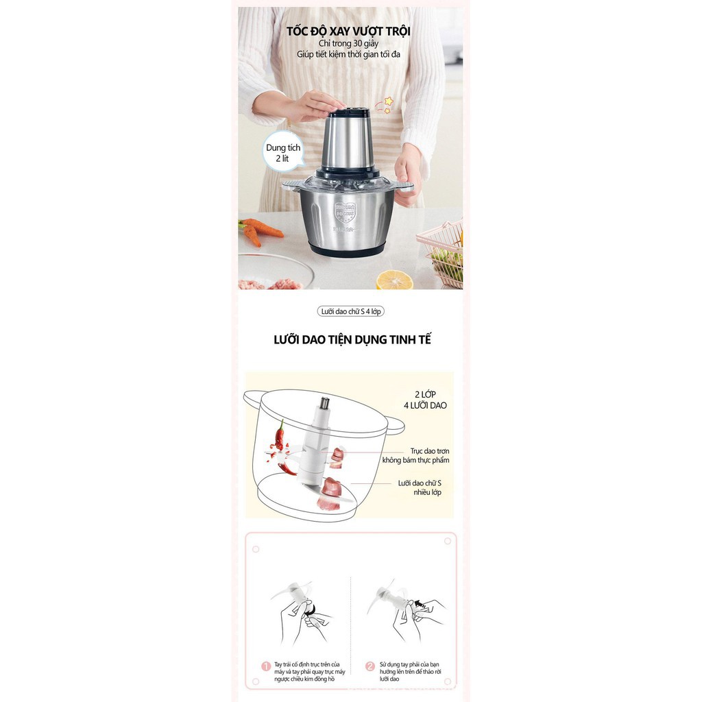 [Loại tốt] Máy xay thịt, máy xay cầm tay đa năng 2 lít công suất lớn cối inox 304 cao cấp