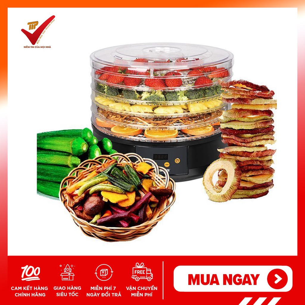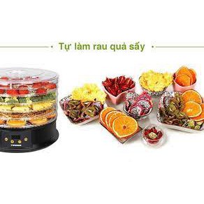 - Máy sấy hoa quả giúp bạn tự làm thịt sấy, rau quả sấy, tự làm được nguyên liệu thuốc bắc và sữa chua. Máy có thiết kế quay tròn, nhiệt sẽ đều hơn, tiêu thụ điện ít mà hiệu quả lại cao.