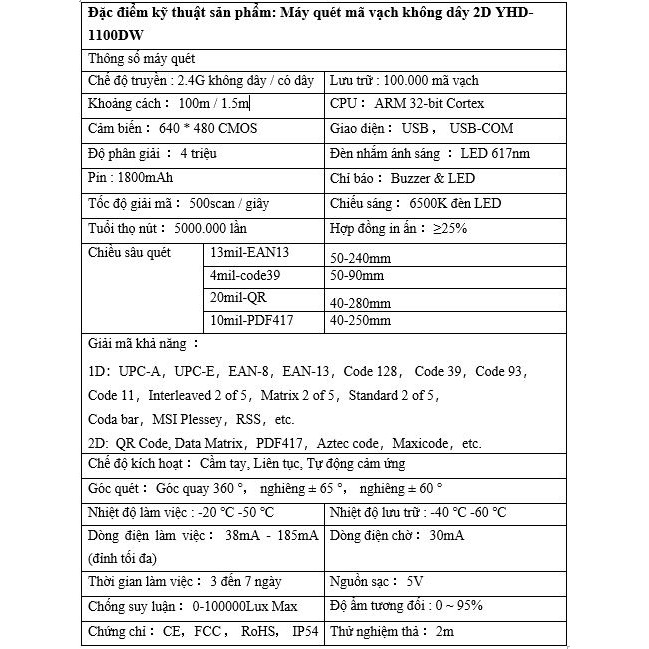 * Tên sản phẩm: Máy quét mã vạch không dây YHD 1100DW 2D