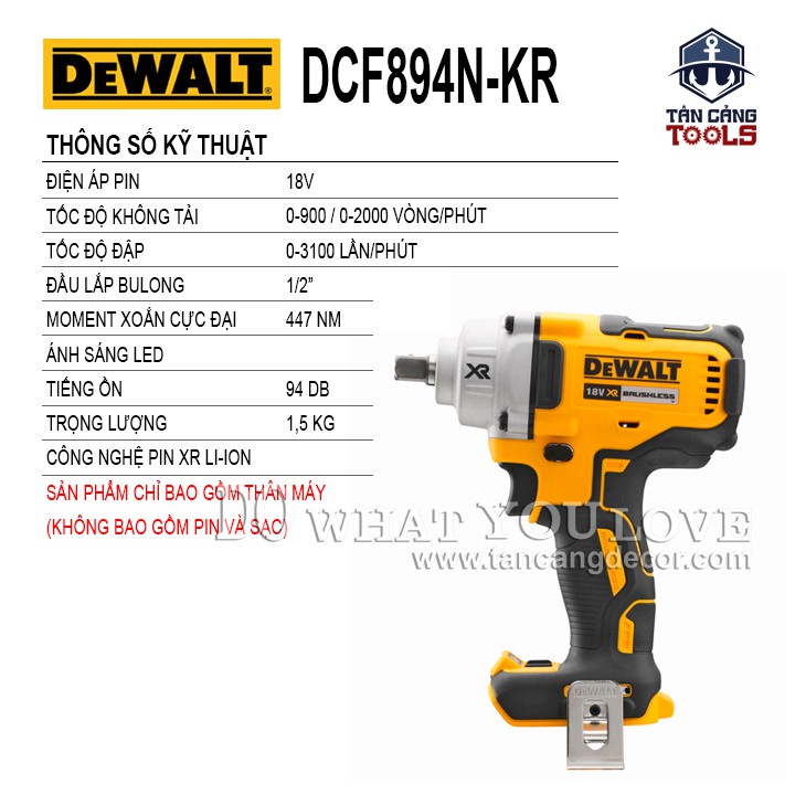 - Máy Siết Bu Lông Dùng Pin DeWalt 18V DCF894N-KR 1/2 Inches hỗ trợ cho việc vặn các loại ốc, vít được nhanh chóng và tiết kiệm sức lực hơn, đem lại hiệu suất công việc cao hơn cách dùng tay thông thường. Sản phẩm được làm từ chất liệu cao cấp, bền bỉ. Bên ngoài máy được làm bằng chất liệu chống trơn trượt, an toàn ngay cả khi tay bạn dính mồ hôi hay dầu mỡ.