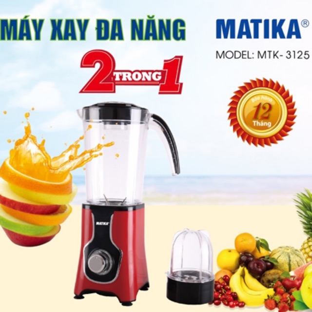 Máy xay sinh tố Matika MTK-3125 lưỡi inox 304, cối nhựa PC cao cấp 2in1Với thiết kế sang trọng, chất liệu cao cấp, máy xay sinh tố Matika MTK-3125 sở hữu 2 cối xay tiện dụng cùng lưỡi dao inox 304 sắc bén bền bỉ, giúp người dùng dễ dàng xay nhuyễn các món sinh tố và thực phẩm cứng như thịt và ngũ cốc siêu tiện lợi.