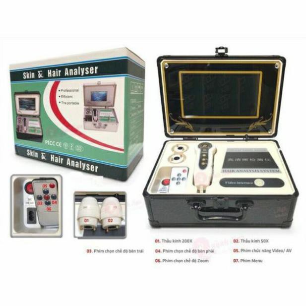 Máy có hai đầu soi: Một đầu soi cho tóc và một là cho da (đầu soi phóng đại 50 lần lúp led để soi da, Và đầu soi phóng 200 lần lúp led để soi tóc)