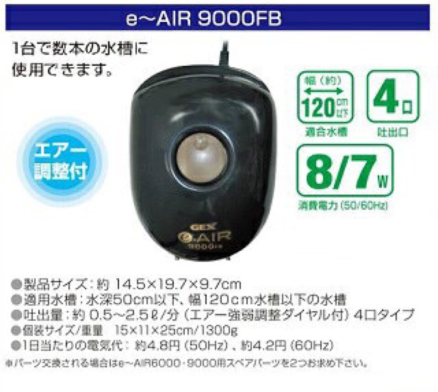GEX E-AIR 9000FB là bộ sủi oxy cao cấp của Nhật, vận hành êm ái không gây ồn. Có thể tùy chỉnh được lưu lượng thổi oxy lớn nhỏ.Thông số kỹ thuật: