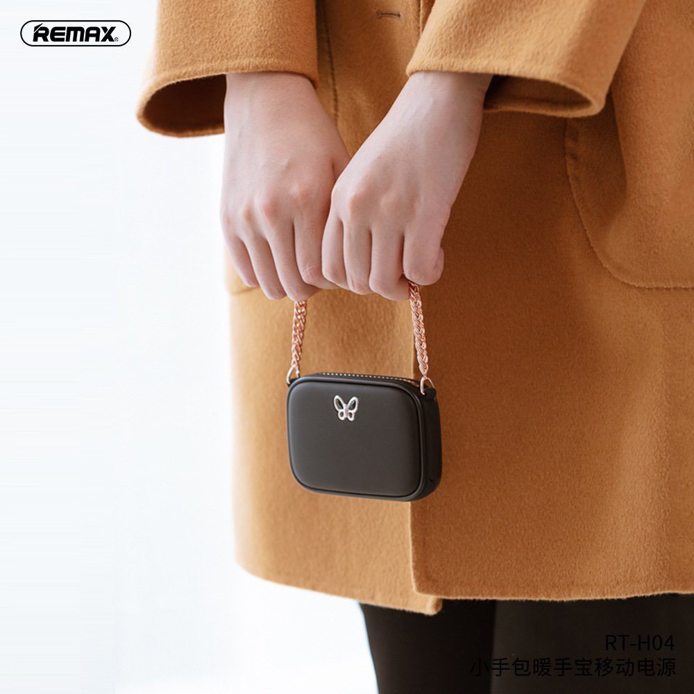 RT-H04 có thiết kế giống như một chiếc túi xách mini vô cùng xinh xắn, phụ kiện không thể thiếu cho mọi quý cô thời trang. Mọi chi tiết trên sản phẩm được thiết kế tinh tế, tỉ mỉ và hoàn hảo đến từng chi tiết. Điểm nhấn cho máy sưởi tay kiêm sạc RT-H04 của Remax đó chính là quai xách, họa tiết cánh bướm kim loại sang trọng.