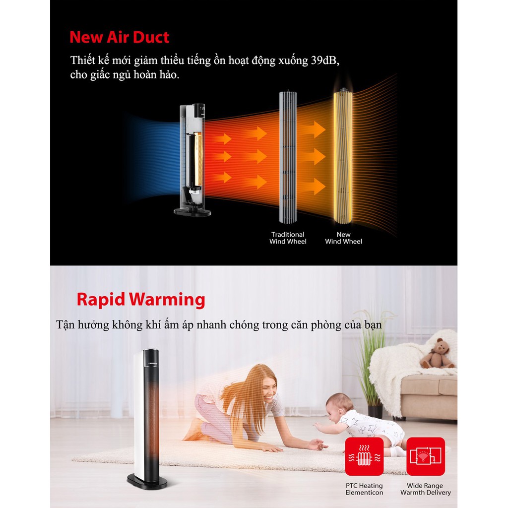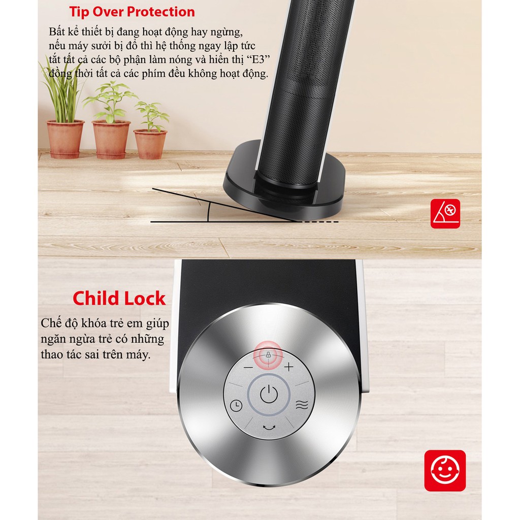 Chân đế bản rộng giúp thiết bị đứng vững, không bị đổ. Máy làm nóng bằng PTC hiện đại cho phép làm nóng không gian lắp đặt trong thời gian ngắn mà vẫn đảm bảo tiết kiệm điện năng tối đa, giảm thiểu chi phí vận hành.