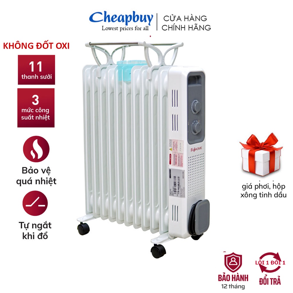 Máy sưởi dầu không đốt oxi không khô da CN Nhật Bản Nhập Khẩu FUJIHOME 11 thanh, sưởi điện tự động ngắt, Bảo hành 1 năm