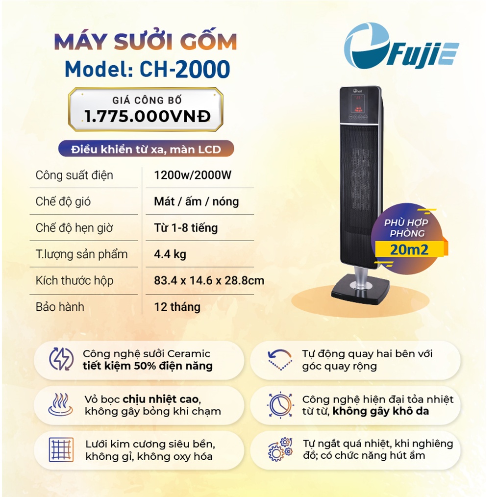 ✅ THÔNG SỐ KỸ THUẬT: QUẠT SƯỞI GỐM CH-2000 (CÓ ĐIỀU KHIỂN TỪ XA + CẢM ỨNG)
