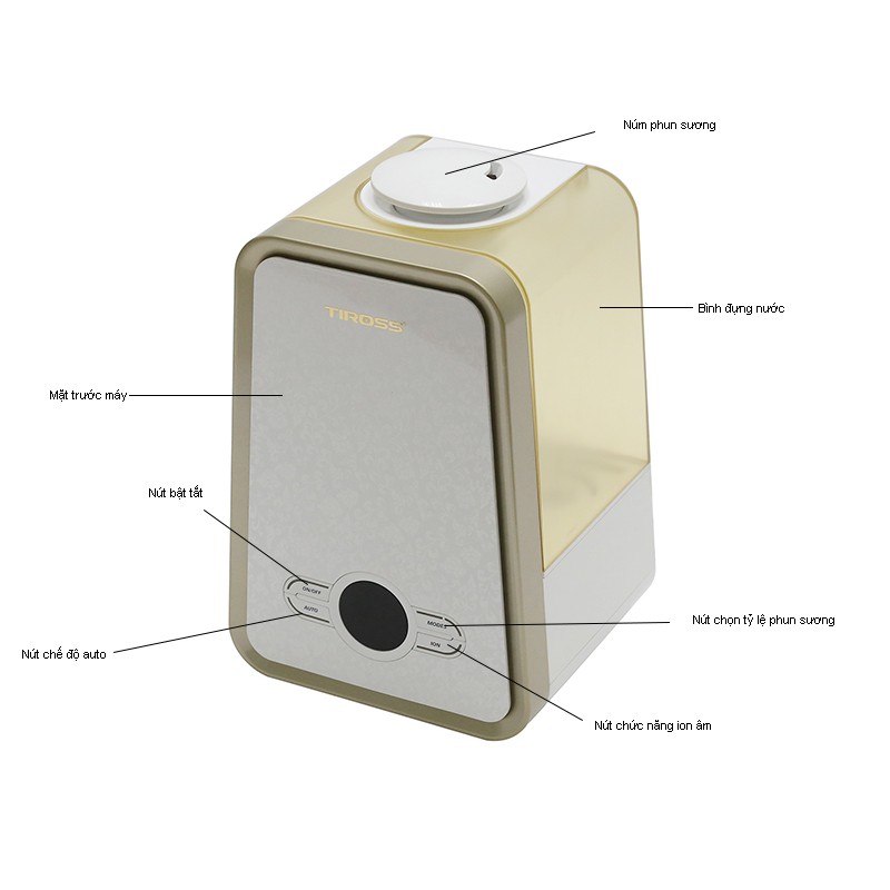 Máy Tạo Ẩm Tiross TS843- Máy có thiết kế hiện đại, sắc nét trong từng chi tiết cùng với màu vàng sáng bóng làm cho sản phẩm trông tinh tế hơn.