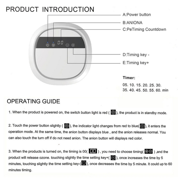 - Khi sử dụng bạn chỉ cầm cắm điện, chạm nút nguồn để khởi động. Bật/tắt chế độ tạo ion âm tuỳ ý theo nhu cầu ở nút thứ 2 nằm kế bên nút nguồn. Cuối cùng, chọn thời gian hoạt động cho máy, tăng/giảm 5 phút mỗi lần chạm vào các biểu tượng tương ứng.