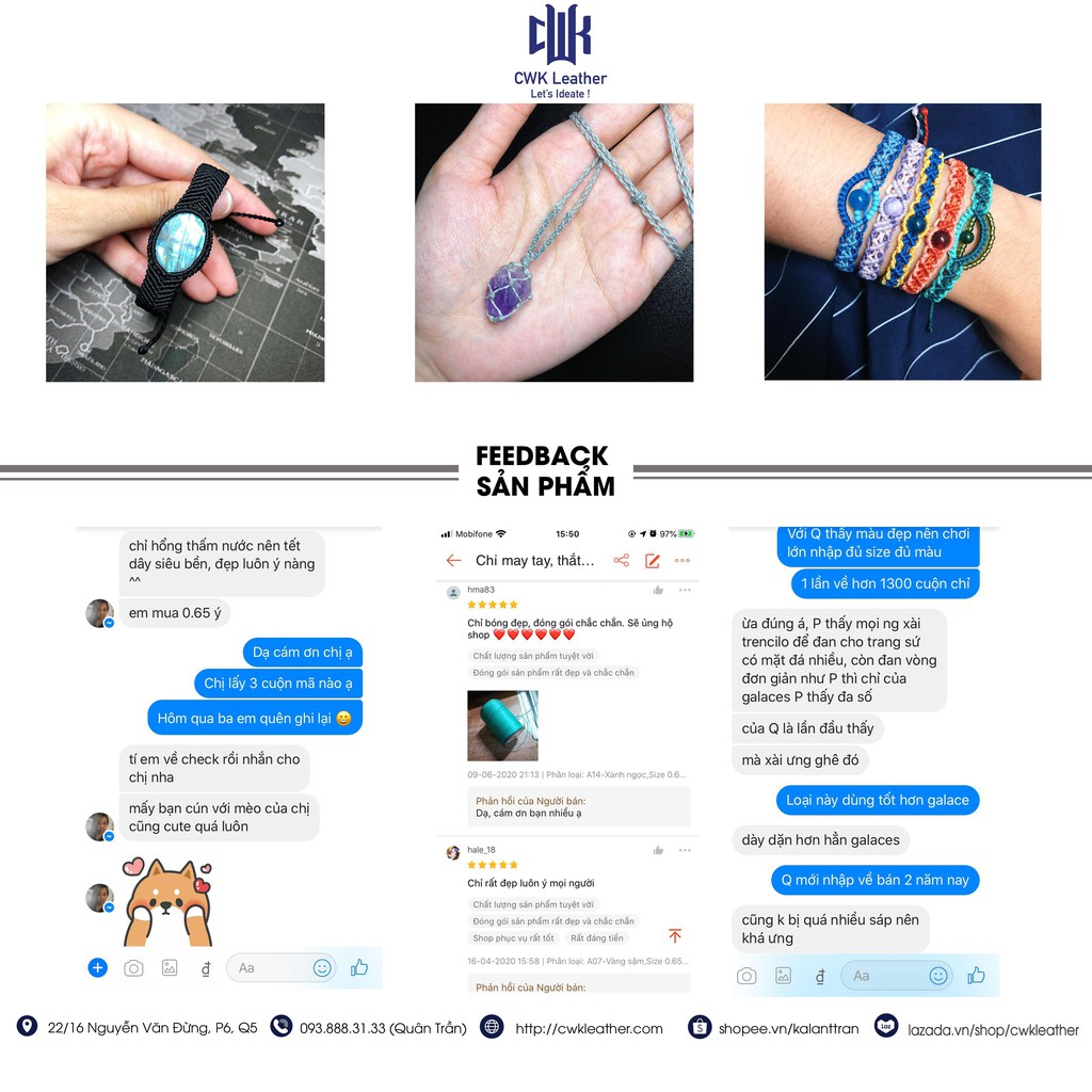 Chỉ Artisan Soul 3 lõi lượng sáp vừa đủ may tay và may máy đều được, chỉ có 29 màu và có 5 size chỉ, riêng size 1mm có 34 màu, về hơn 1200 cuộn full size và full bảng màu.Loại chỉ này có giá tầm trung, dùng khá ổn, ưu điểm là có nhiều màu và sợi chỉ đanh, nếu may dây nịt chuốt nhẹ thêm tí sáp là được ạ, chỉ dòng này may đẹp nhất là size 0.35mm.
