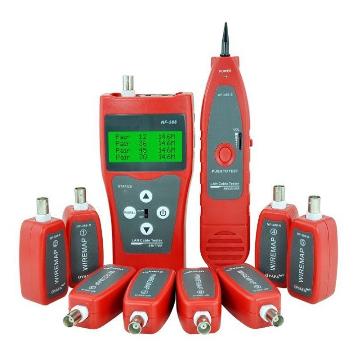 Máy test cable Mạng đa năng RJ 45, RJ 11, USB, cáp đồng trục, Model NF-388, với màn hình hiển thị LCD, đo được số mét, số feet trên chiều dài đoạn dây, xác định đựơc vị trí đứt và nhiều tính năng khác như sau: