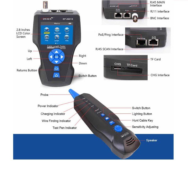 Bên cạnh đó, việc tìm kiếm cáp dễ dàng hơn và truy tìm với AC fliter, hoặc định vị cổng mạng sử dụng hub blink tính năng. NF-8601S cũng kiểm tra các sự hiện diện của PoE và PING chức năng.