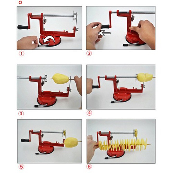 - Máy có thiết kế đơn giản với công dụng chính là cắt cả củ khoai tây ra thành lát mỏng dạng lốc xoáy hoặc xoắn vòng.