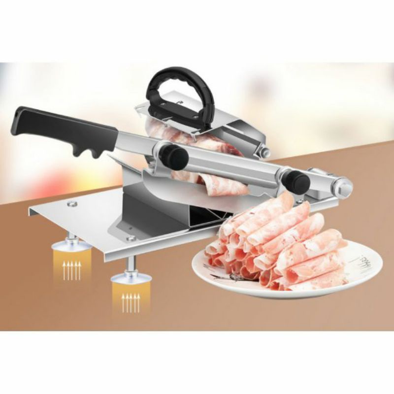 Máy cắt thịt bằng tay được chế tạo bằng vật liệu inox cao cấp 304. Máy chuyên dùng thái thịt bò, thịt lợn, thịt cừu, thịt dê, thịt bê, thịt trâu... đông đá.Ngoài ra máy còn thái được củ quả như khoai tây, cà rốt, dưa chuột, thịt hun khói, giò chả....Với kiểu dáng nhỏ gọn, chất liệu 100% inox cao cấp, nhìn máy rất bắt mắt và thẩm mỹ cho các đầu bếp sử dụng. Điểm quan trọng nhất là lát cắt thịt rất sắc ngọt như các máy thái bằng điện, nhưng chuẩn mực và tinh tế hơn khi có bàn tay thái của người chế biến.