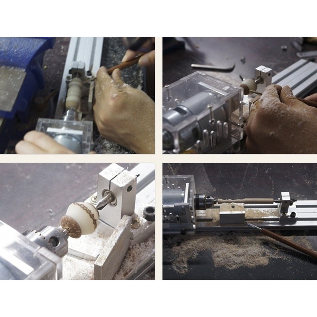 Bộ sản phẩm: 1 máy tiện, 10 dao tiện + 33 đầu bông đánh bóng + 1 dây chuyển độngChất liệu: hợp kim nhôm và acrylic