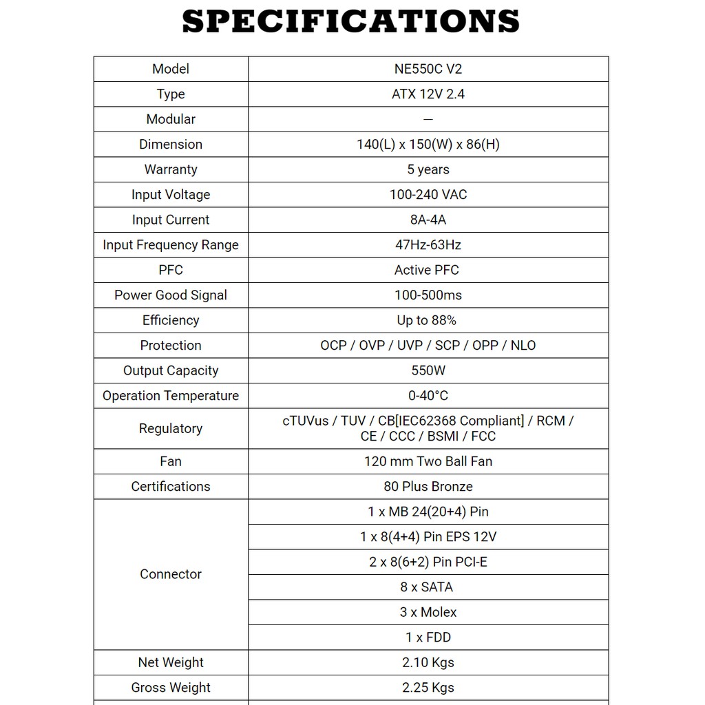 * Thông tin sản phẩm:- Tên sản phẩm: Nguồn máy tính Antec NE550C v2 - 550W 80 Plus Bronze