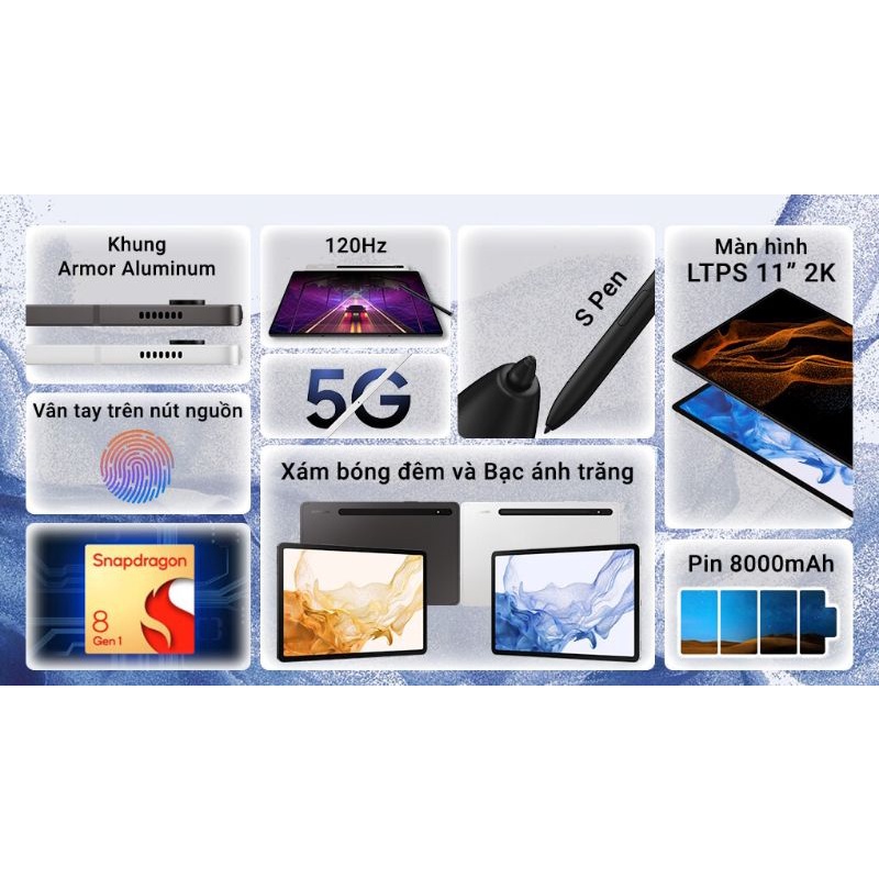 Galaxy Tab S8 có màn hình 11 inch, độ phân giải đến 2K cho bạn trải nghiệm cực mãn nhãn, cùng với tần số quét 120 Hz mọi chuyển động trên màn hình đều trở nên mượt mà.