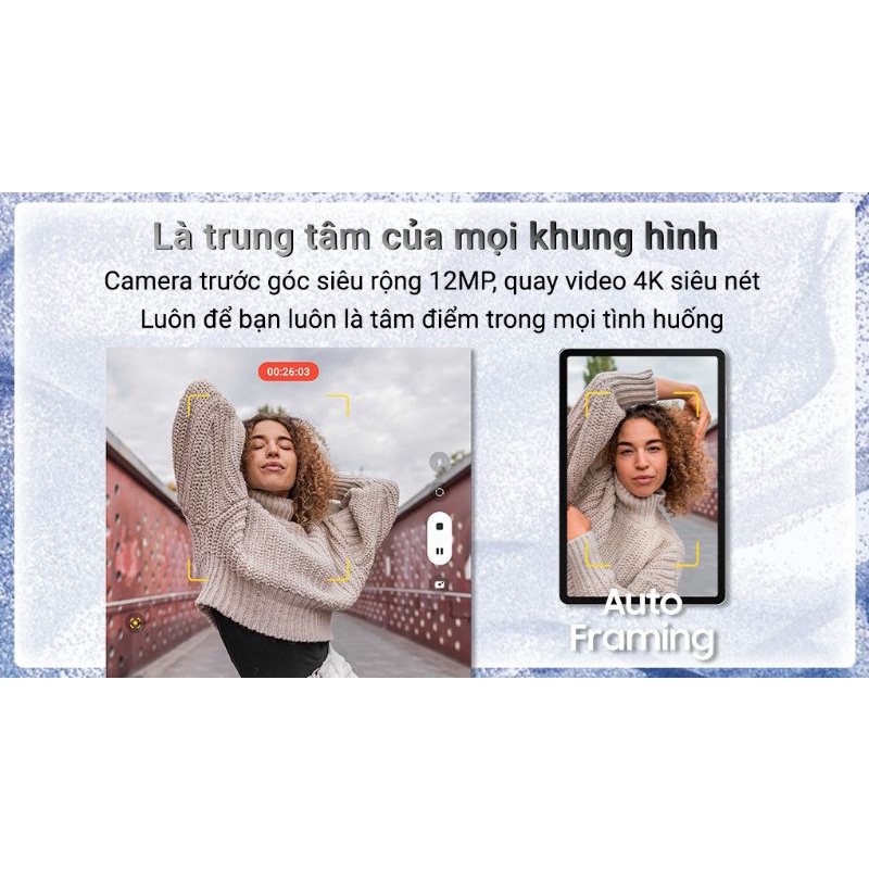 Tab S8 có cụm 2 camera với camera chính 13 MP và camera phụ 6 MP, hỗ trợ quay video độ phân giải 4K. Camera trước góc siêu rộng 12 MP với tính năng Auto Framing luôn đặt bạn vào trung tâm khung hình trong mọi tình huống.