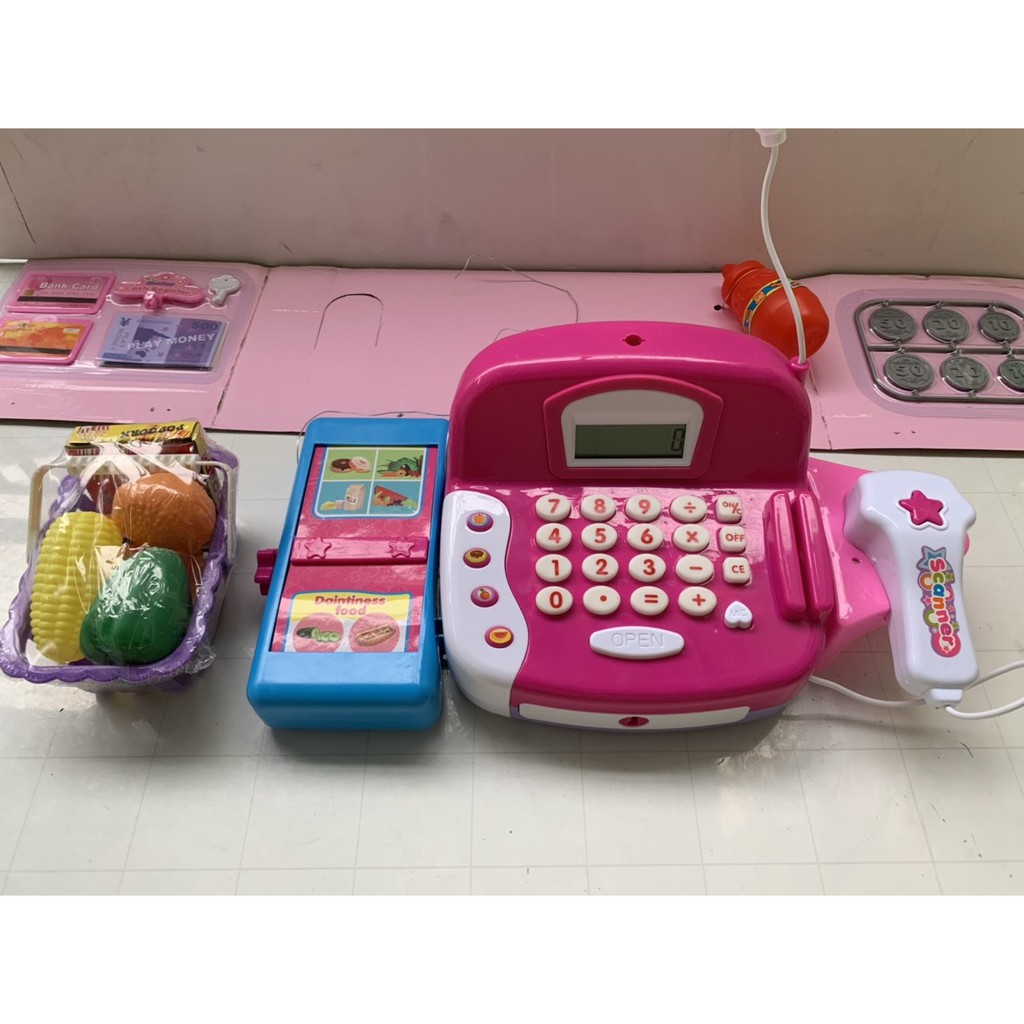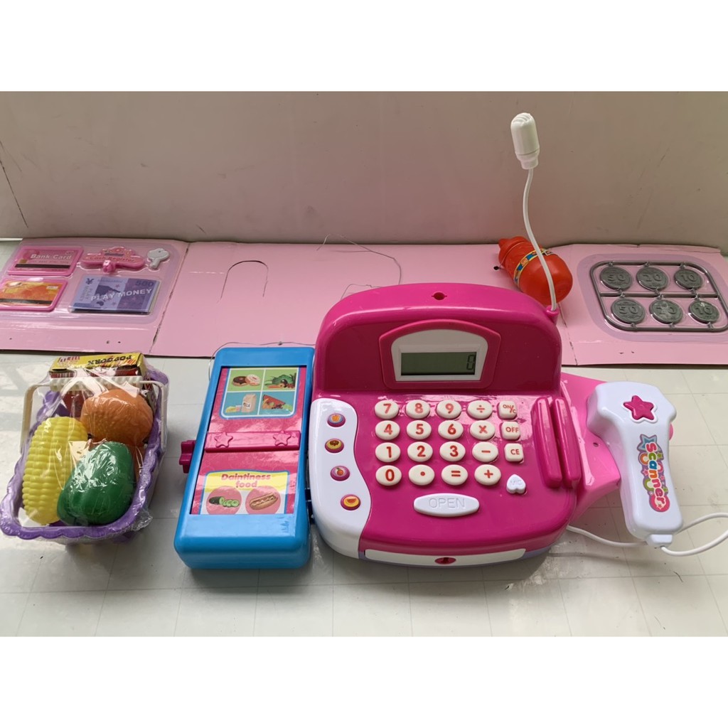 Máy tính tiền siêu thị là bộ đồ chơi đẹp bằng nhựa tốt cao cấp chạy bằng 2 cục pin, khay tính tiền có thể mở ra được, đồ tính tiền phát ra tiếng kêu giống như trong siêu thị, có cân, khay chạy , có máy quét đồ , mở két sắt cho tiền vào ,các con số trên bàn tính có phát nhạc.Micro hoạt động như thật, máy chạy hàng khi tính tiền, giỏ đựng hàng hoá, hàng hoá đa dạng.