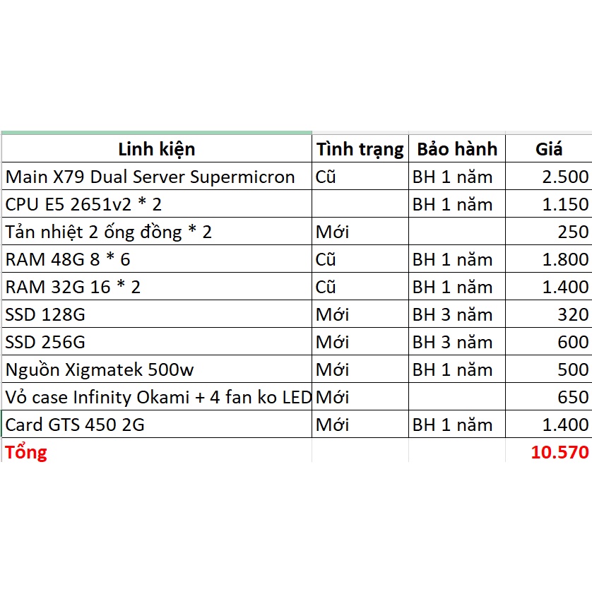 - Main x79 Dual: Main thì có 2 loại, main TQ mới và Main server cũ, đều BH 1 năm. Bảng giá 2 loại main trên gần như tương đương