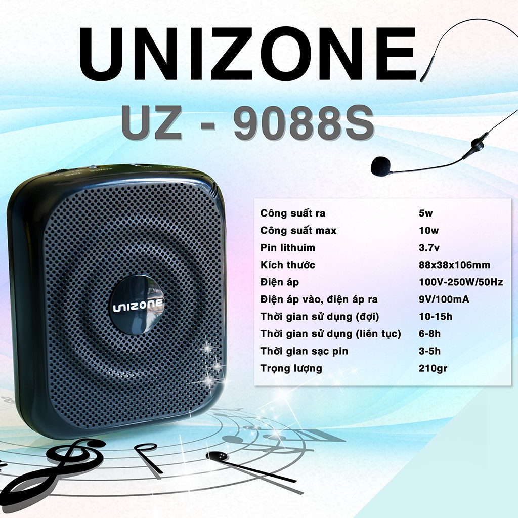 Unizone 9088 sử dụng pin lithium (7.4V 1000Ma), cần dùng cáp, sạc 3 – 4 tiếng để sạc đầy. Thời lượng pin của thiết bị là 8 giờ/lần sử dụng, quá đủ để người dùng thực hiện hoạt động giảng dạy, thuyết trình trong cả ngày làm việc, thời gian chờ là 20 giờ. Thiết bị mang công suất tối đa 20W nhưng âm thanh phát ra vẫn đáp ứng chuẩn hệ thống PA.