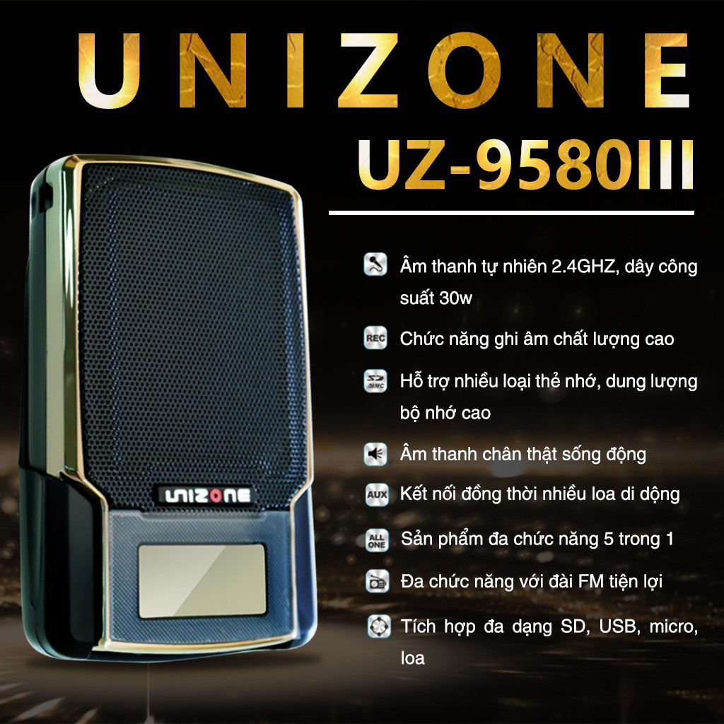 Một model máy trợ giảng không dây lâu đời của Unizone Hàn Quốc. Đã qua 3 phiên bản F1, F2, và hiện tại là F3. Kế thừa và cải tiến đã giúp cho phiên bản F3 có tên tuổi suốt nhiều năm qua. Đó chính là máy trợ giảng không dây Unizone 9580 F3 hay còn gọi là phiên bản Pro của dòng 9580.Cách đây 5,6 năm thì Unizone 9580 F3 là mẫu máy trợ giảng không dây hiện đại và được nhiều người sử dụng nhất. Cho tới thời điểm hiện tại, vẫn còn rất nhiều thầy cô đang dùng máy còn rất bền và âm thanh tốt.