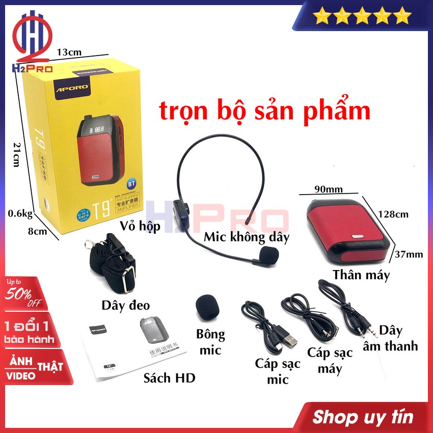 Máy trợ giảng Aporo T9 Plus H2Pro hàng hãng-micro không dây-Bluetooth 5.0-USB-Thẻ nhớ-Đài FM (1 bộ) (tặng mic 169k)