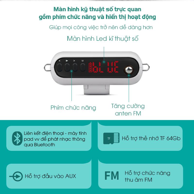 • Máy còn có chức năng bluetooth, ghi âm có thể liên kết với điện thoại, máy tính, PAD để phát nhạc hoặc phát các file tài liệu