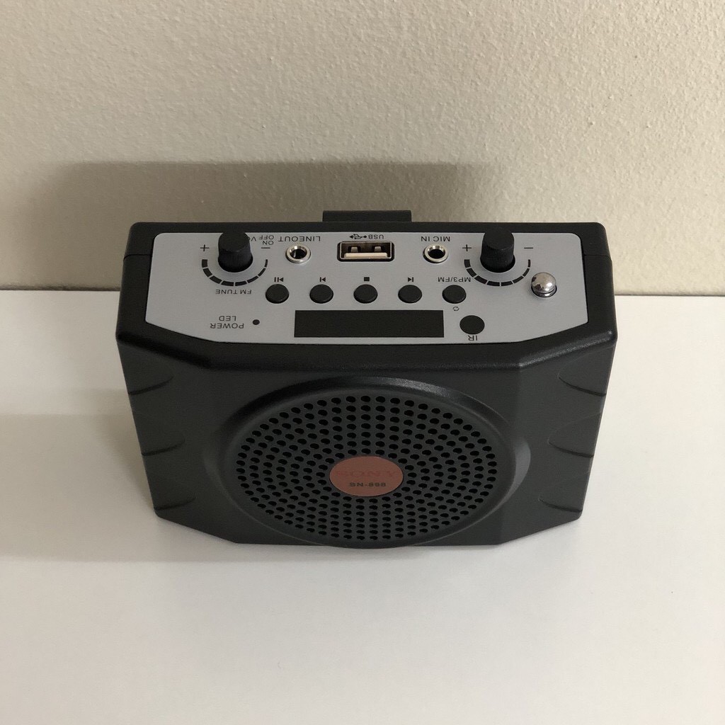 - Máy trợ giảng SONY SN-898 còn tích hợp hát nhạc qua USB, thẻ nhớ MicroSD, FM rất tiện dụng. Các ban có thể tải một vài bài beat hay để hát cùng bạn bè. Thích hợp với người làm nghề hướng viên dẫn du lịch, giáo viên, giảng viên, bán hàng ngoài trời ,thuyết trình, hội thao v.v... giúp bạn không cần tốn sức mà giọng vẫn lớn, rõ ràng, dễ nghe.