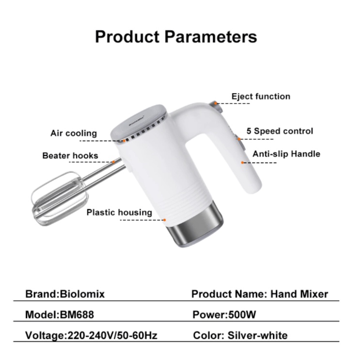 Máy trộn bột, đánh trứng, tạo bọt 3 trong 1 Biolomix BM688Thông số kỹ thuật