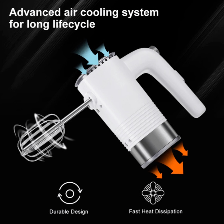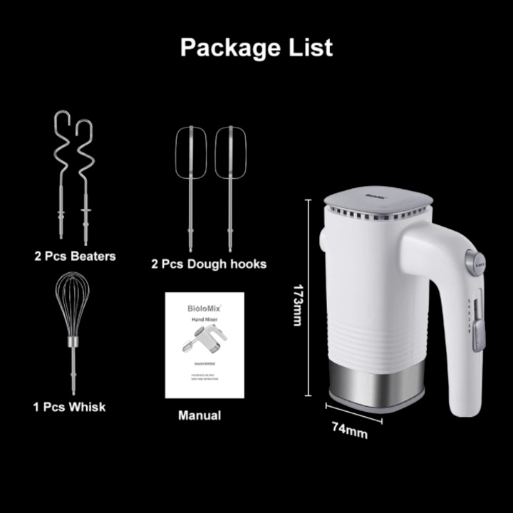 - Phụ kiện kèm theo: 1 x Máy trộn, 2 x Que đánh trứng, 2 x Que đánh bột, 1 x Que tạo bọt