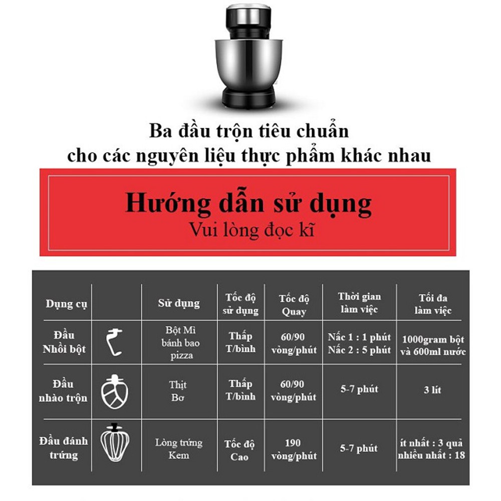 ✅Bộ sản phẩm : 1 máy chủ ; 1 tô chứa bột ; 1 đầu móc nhào bột; 1 đầu nhào trộn; 1 đầu đánh trứng; 1 thìa múc thực phẩm; 1 nắp đậy tô trong suốt; 1 hướng dẫn sử dụng