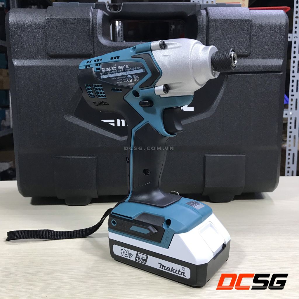 - Máy vặn vít Makita M6901D sử dụng dòng pin 18V BL1815G là dòng pin tiết kiệm của Makita, dòng pin này có thể sử dụng chung cho các dòng máy như: DF457D, HP457D, JV183D.