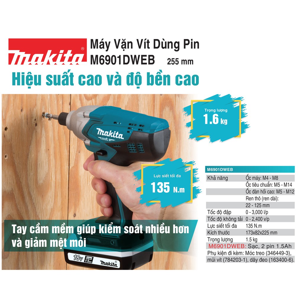 * DCSG cam kết chỉ bán hàng chính hãng Makita, hoàn tiền gấp đôi nếu phát hiện sản phẩm không phải hàng chính hãng do Makita Việt Nam phân phối.- Mã sản phẩm: M6901DWEB