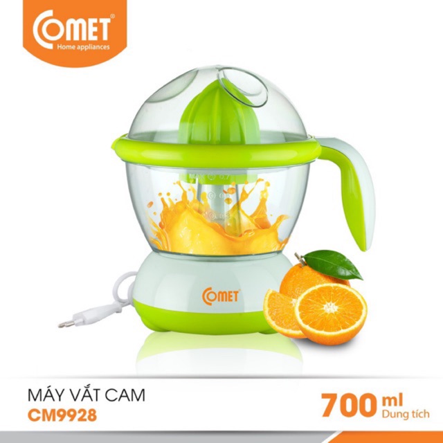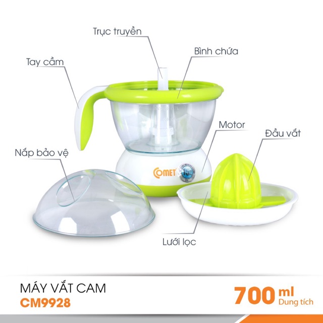 - Máy vắt cam Comet CM9928 thiết kế tiện lợi, dễ sử dụng và nhưng không kém phần sang trọng, được chế tạo bằng loại nhựa AS trong suốt cao cấp an toàn khi tiếp xúc với thực phẩm, giúp bạn dễ dàng quan sát lượng nước trái cây bên trong khi đang vắt hoặc khi sử dụng.