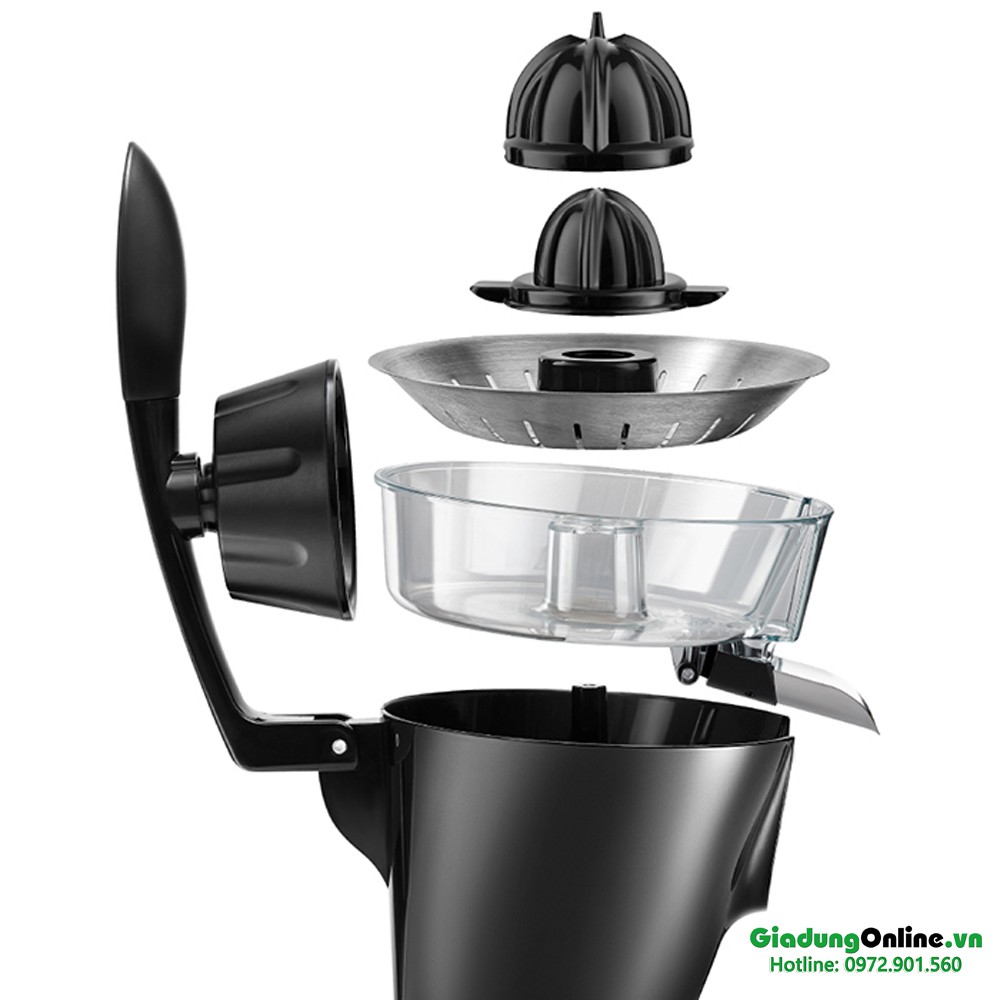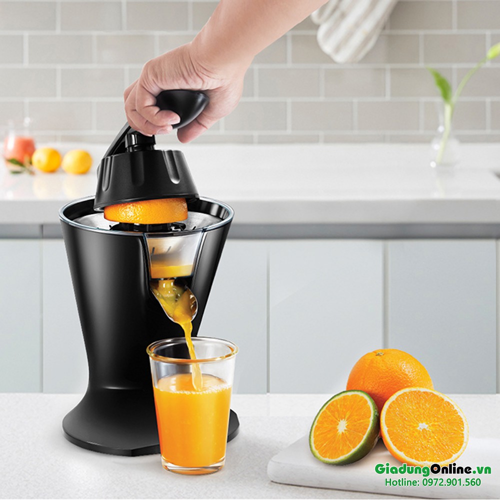 - Máy có tay cầm để nhấn ép cam quýt, nhờ vậy nên việc ép nước cam đơn giản và dễ dàng hơn.