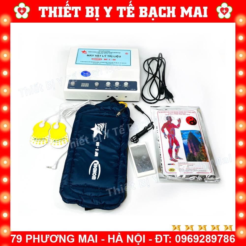 Máy vật lý trị liệu Wonder MF 5 – 08 do Viện KH&CNQS Bộ Quốc Phòng sản xuất với công nghệ của Nhật. Máy đã được kiểm nghiệm lâm sàng, đánh giá sự an toàn khi điều trị với nhiều tính năng vượt trội khác. Máy đã được nhận “Cúp vàng sản phẩm dịch vụ xuất sắc năm 2009 “ vì sức khỏe và sự phát triển của cộng đồng. Các tính năng trong Wonder MF 5 -08 như: Đặt thời gian làm việc, điều chỉnh nhiệt độ, cường độ ion và cường độ dòng điện xung. Thao tác đơn giản, màn hình led hiển thị thời gian, ứng dụng rộng rãi, có thể sử dụng nguồn điện xoay chiều 110V hoặc 220V, có thể sử dụng nguồn điện một chiều 12 V thay thế khi mất điện. Thiết kế máy “WONDER MF5-08” thuận tiện,mẫu mã đẹp, an toàn khi sử dụng* CHỨC NĂNG CỦA MÁY WONDER MF5-08