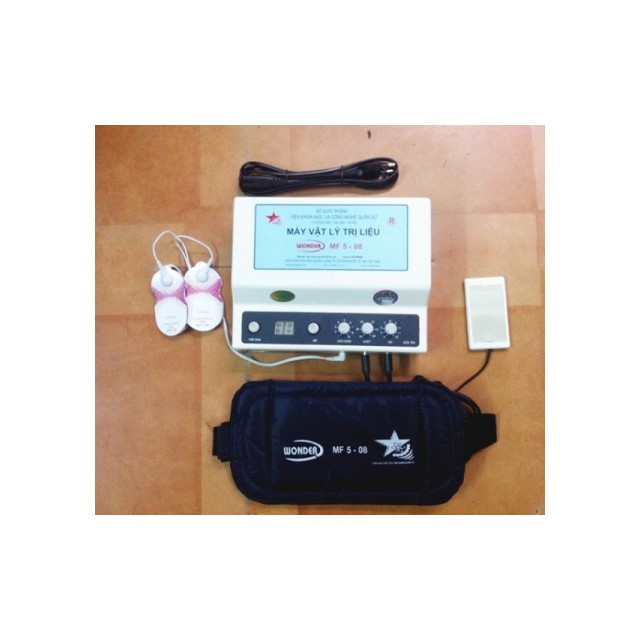 Máy vật lý trị liệu Wonder MF 5 – 08 do Viện KH&CNQS Bộ Quốc Phòng sản xuất với công nghệ của Nhật. Máy đã được kiểm nghiệm lâm sàng, đánh giá sự an toàn khi điều trị với nhiều tính năng vượt trội khác. Máy đã được nhận “Cúp vàng sản phẩm dịch vụ xuất sắc năm 2009 “ vì sức khỏe và sự phát triển của cộng đồng. Các tính năng trong Wonder MF 5 -08 như: Đặt thời gian làm việc, điều chỉnh nhiệt độ, cường độ ion và cường độ dòng điện xung. Thao tác đơn giản, màn hình led hiển thị thời gian, ứng dụng rộng rãi, có thể sử dụng nguồn điện xoay chiều 110V hoặc 220V, có thể sử dụng nguồn điện một chiều 12 V thay thế khi mất điện. Thiết kế máy “WONDER MF5-08” thuận tiện,mẫu mã đẹp, an toàn khi sử dụng* CHỨC NĂNG CỦA MÁY WONDER MF5-08