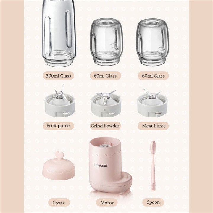 * Máy xay có 3 lọ, mỗi lọ được sử dụng như máy xay sinh tố, máy xay thực phẩm hoặc máy xay thịt. Bình chứa được làm bằng vật liệu cấp thực phẩm và không chứa BPA nên an toàn khi sử dụng. Thực tế hơn, bạn có thể trực tiếp sử dụng bình làm hộp lưu trữ bằng cách thêm nắp.* - Nhỏ gọn tiện dụng có thể vừa mang đi làm hay mang đi chơi