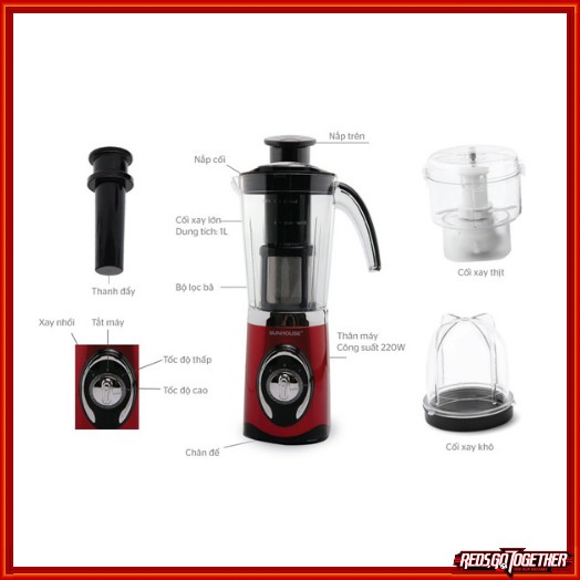 Máy xay sinh tố đa năng SUNHOUSE SHD5323R có thiết kế hiện đại với một cối xay sinh tố kèm lưới lọc bã và 1 thanh đẩy giúp bạn xay trái cây được nhanh hơn, sánh mịn hơn. Bên cạnh đó là 1 cối xay thực phẩm khô và 1 cối xay thịt, đáp ứng mọi nhu cầu làm bếp của bạn.Sản phẩm hoạt động với công suất 220W, điều khiển dễ dàng bằng núm xoay và được bảo vệ an toàn nhờ khóa thông minh (chỉ hoạt động khi đã lắp chặt vào khớp). Đây là sản phẩm nên có trong mọi căn bếp gia đình.
