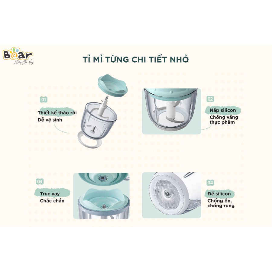 - Máy xay ăn dặm mini Bear QSJ-C02K1 (GR-B06V1) dung tích 600ml kết hợp với công suất 200W cho hiệu quả xay tốt nhất. Toàn bộ thiết bị được làm từ chất liệu nhựa ABS cao cấp, cối xay thủy tinh, lưỡi xay inox 304 không gỉ an toàn cho bé. Trải nghiệm ngay phiên bản máy xay ăn dặm thông minh QSJ-C02K1 tại Bear Việt Nam.