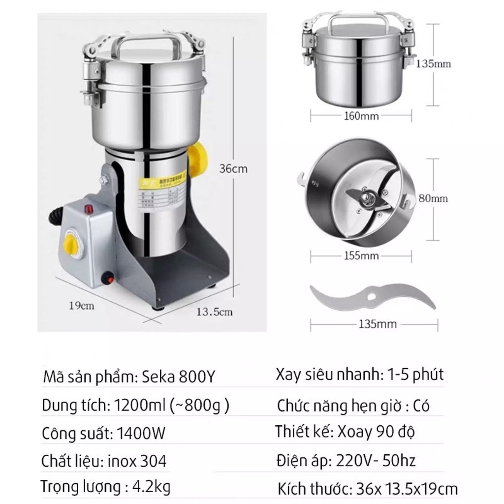 Sản phẩm máy xay được thiết kế từ kim loại cho độ bền tốt, Lưỡi cắt được làm tốt cũng giúp cho việc xay nguyên liệu trở nên dễ dàng hơn. Bạn có thể xay được nhiều loại nguyên liệu khác nhau để tạo ra sản phẩm có độ mịn.