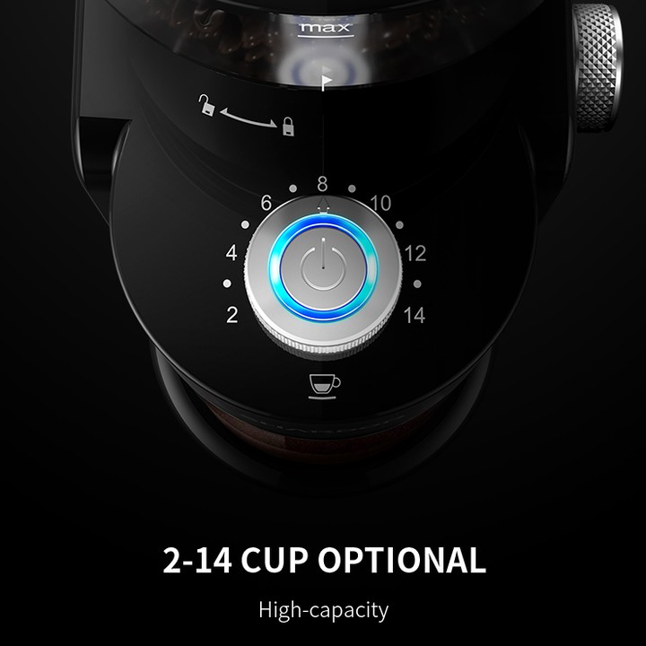 - Dung tích ngăn chứa cà phê hạt đạt 240g tương đương với 14 tách cà phê. Với chức năng định lượng cà phê, máy sẽ tự động xay đủ với định lượng mà bạn đã lựa chọn và tự động tắt máy khi đã kết thúc chương trình giúp bạn không phải mất thời gian kiểm soát quá trình xay của máy.