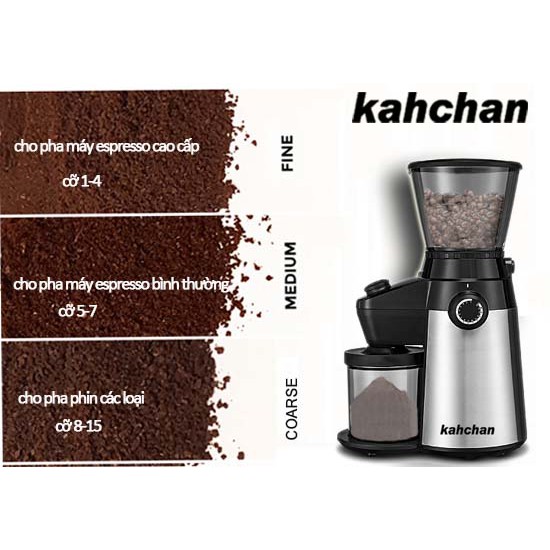 2.Máy xay cafe chuyên nghiệp kahchan có nút bên phải dùng để điều chỉnh độ mịn cà phê tùy theo dụng cụ pha chế, (máy hoặc phin). Độ mịn từ 1-15