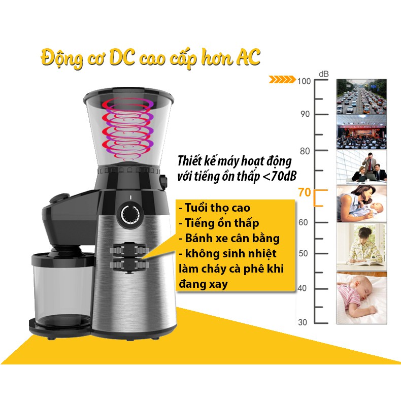 1. Máy xay cafe, xay ngũ cốc, xay thuốc chuyên nghiệp kahchan sử dụng moter DC , Khác Với moter AC,quá trình xay ra nhiệt ít, không làm cháy cà phê, không làm cháy moter ,bảo vệ mùi thơm của cà phê, tiếng ồn thấp,